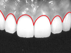 前歯の歯頸部(歯肉が肉と接触する部分)を結んだラインのことを差します。キレイな曲線を描いて、左右対称となっているのがもっとも理想的な形です。このガムラインで歯の縦横比率が決まってくるので歯のプロポーションにとっては重要なラインとなります。